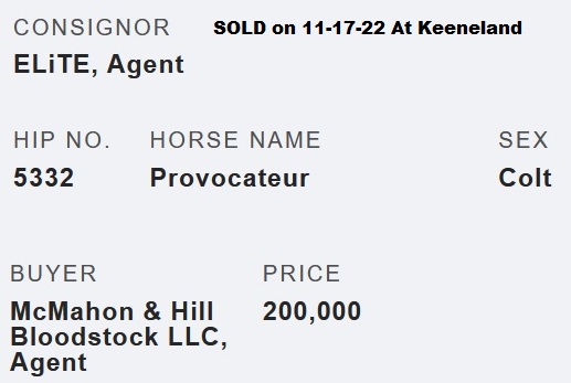 Provocateur sold yesterday (11-17-22) at Keenland for $200,000, we hope to update you on his future plans with his new owners.