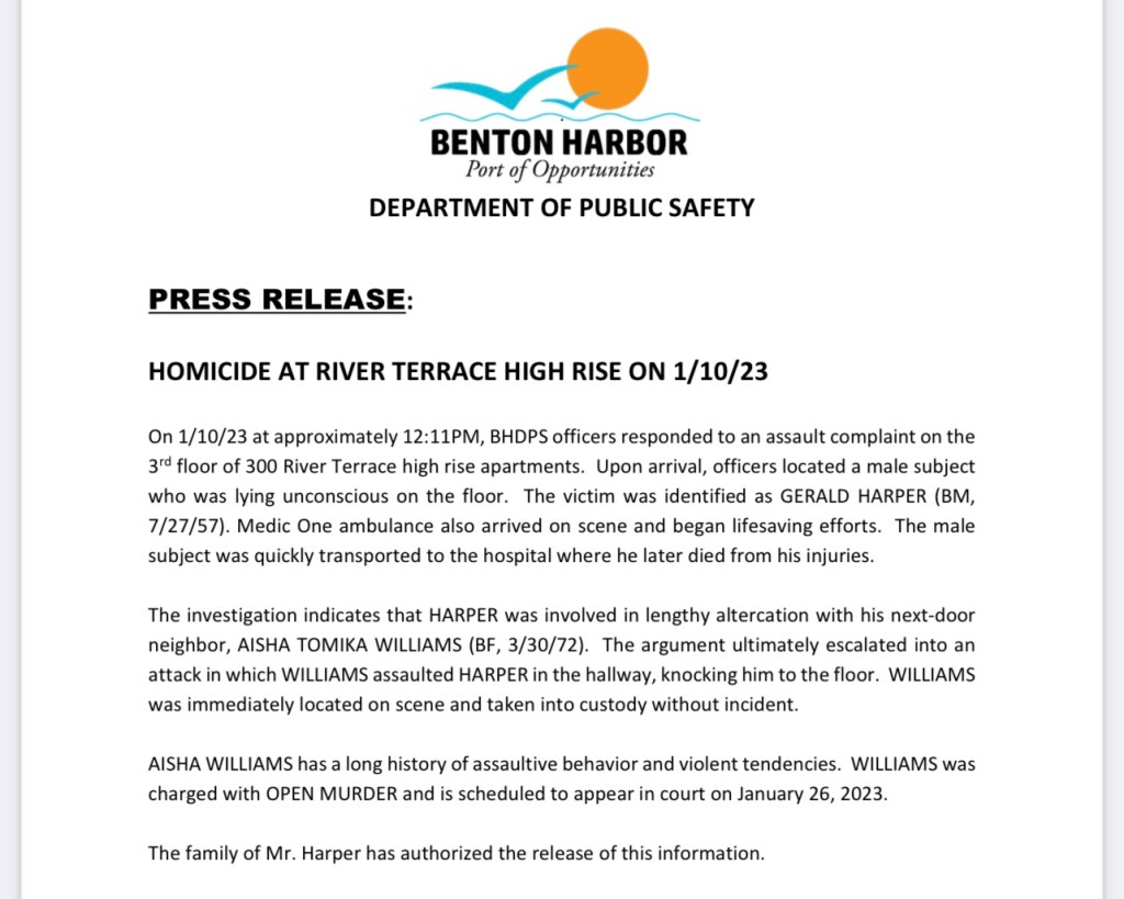 2023, Berrien County Outlook Benton Harbor Murder Date: January 16, 2023Author: statelinesportsnetwork 0 Comments Gerald Harper (1-16-23) Details of a January murder in Benton Harbor between neighbors. Share this: Click to share on X (Opens in new window) X Click to share on Facebook (Opens in new window) Facebook Like Loading... Related