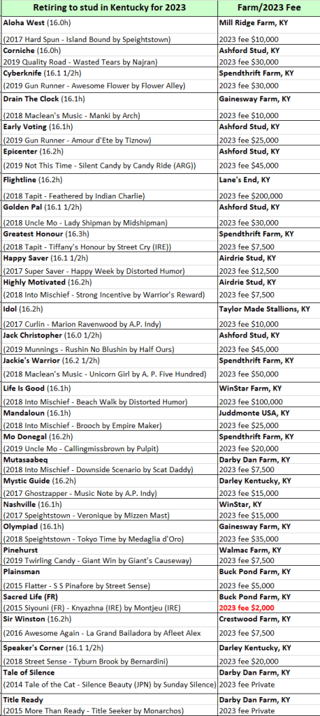(2-8-23) Moretti (Medaglia d’Oro–Rigoletta, by Concerto), a two-time stakes winner and who twice placed at the Grade II level, will begin covering mares at Chesapeake Farm in Lexington, Kentucky, the 7 year old stallion will stand for $5,000.