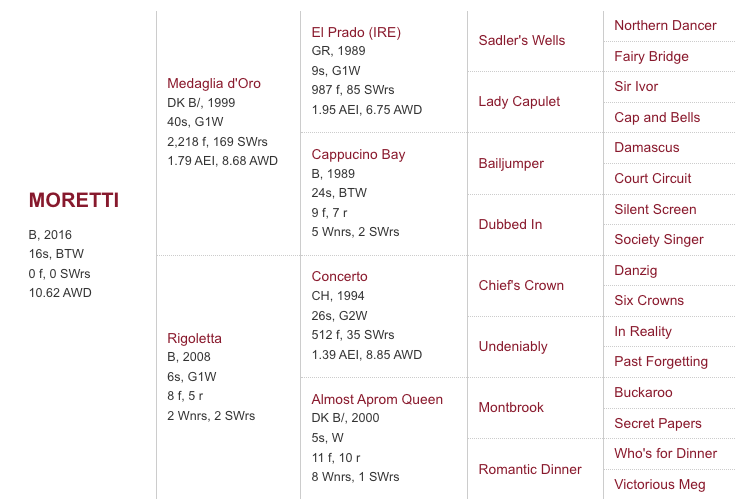 Moretti offers breeders a strong bloodline, the list below shows he is the only new addition by Medaglia d’Oro. His fee is quite reasonable at $5,000, French bred Stallion Sacred Life, standing at Buck Pond Farm is the only sire listed below him with a lower fee at $2,000.