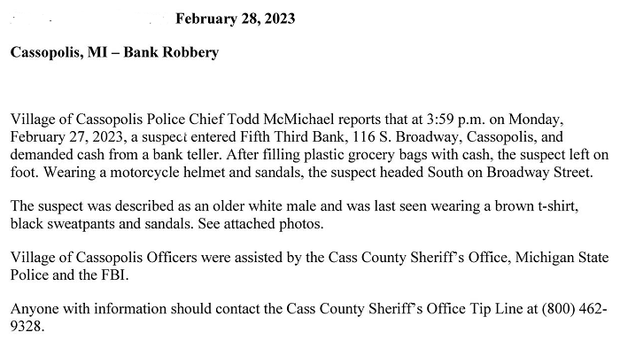 2023, Berrien County Outlook Cassopolis Bank Robbery, Looking For Suspect Date: February 28, 2023Author: statelinesportsnetwork 0 Comments Share this: Click to share on X (Opens in new window) X Click to share on Facebook (Opens in new window) Facebook Like Loading... Related