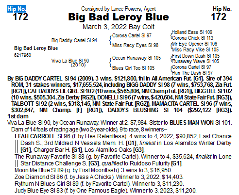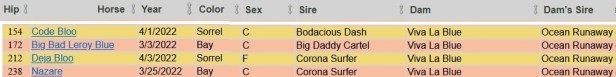 Below are four yearlings to be sold at the 2023 Ruidoso New Mexico Bred Quarter Horse & Thoroughbred Yearling Sale starting on August 11th. Thanks to AQHA allowing AI and embryo transfer Viva La Blue has four of her offspring as a part of the yearling sale. Something you would never see (yet) in the thoroughbred world. Other mares will have multiple yearlings for sale.