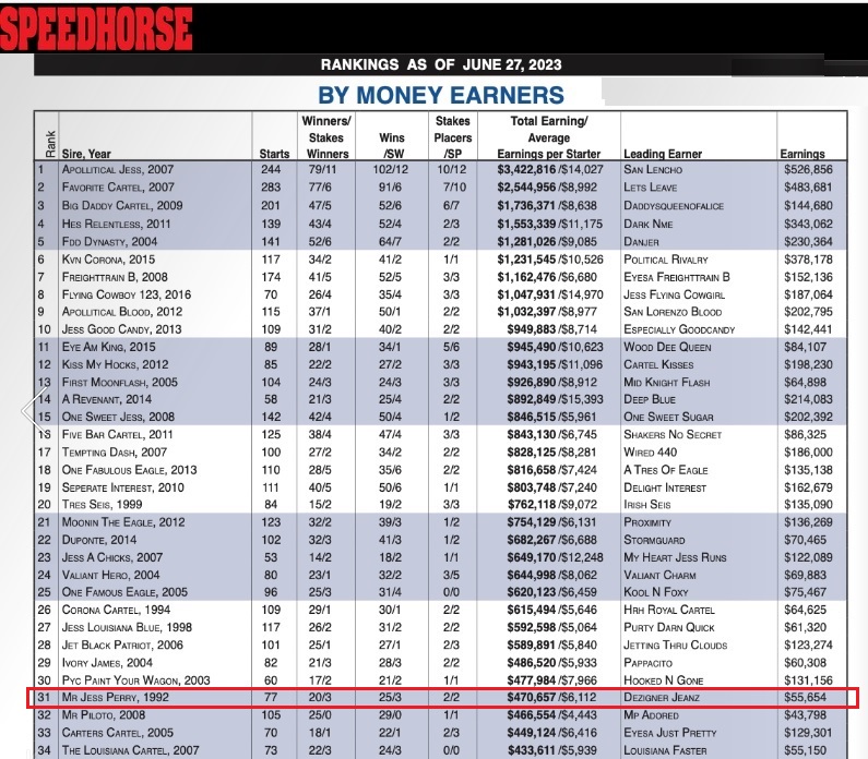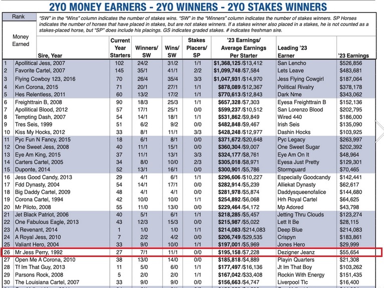 Hall of Fame Stallion Mr Jess Perry ((Streakin La Jolla – Scoopie Fein, by Sinn Fein)) is just on those examples. The stallion was born in 1992 and passed away in 2017…6 years ago. Yet he is listed in the recent Speedhorse Magazine as one of the top producing stallions of 2-year olds in 2023.