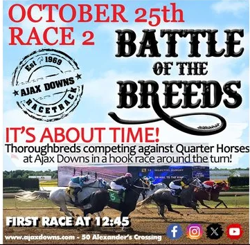(10-24-23) Canada’s Ajax Downs in Ajax, Ontario will feature tomorrow in Race 2 the ‘Battle of the Breeds‘. Quarter Horses vs, Thoroughbreds in an 870-yard race (about four furlongs) around a turn.