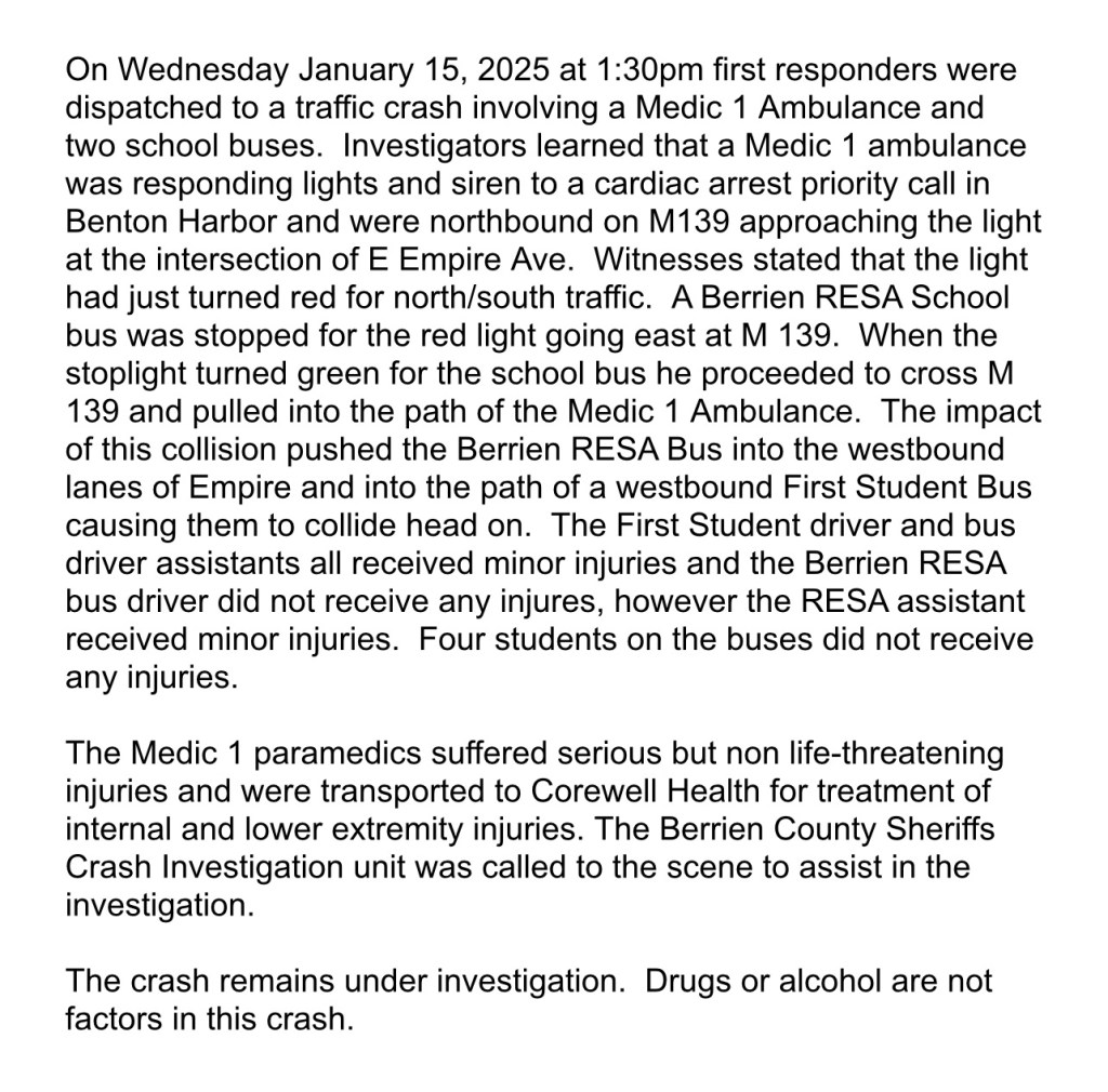 Berrien County Outlook Ambulance – Two School Buses Collide In Benton Harbor Date: January 15, 2025Author: statelinesportsnetwork 0 Comments Share this: Click to share on X (Opens in new window) X Click to share on Facebook (Opens in new window) Facebook Like Loading... Related