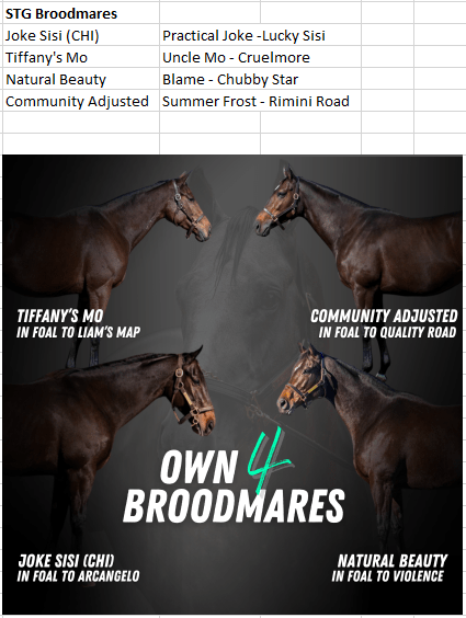 An option that continues to grow in the ‘fractional share‘ business is shares in broodmares, including one by MyRacehorse that includes four mares. They were all purchased in foal to quality stallions and bred to Seize The Grey for his first group of future foals. Yes disappointment…already after several attempts with STG Tiffany’s Mo was not pregnant and will not be bred again until to 2026 and will take this time off.