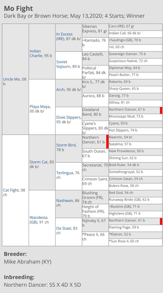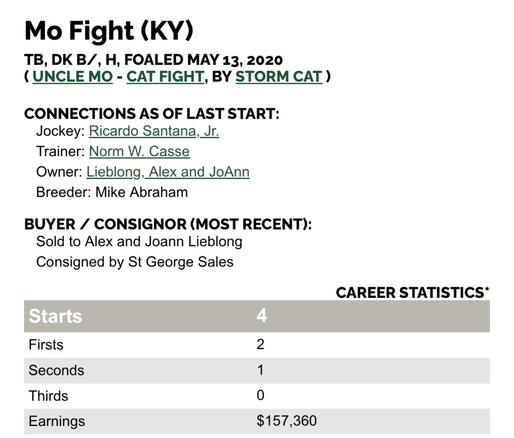 (8-20-25) Mo Fight (5 year old thoroughbred gelding bred in KY by Uncle Mo (Indian Charlie) out of Cat Fight by Storm Cat) and is presently available for a 2nd career adoption at Second Stride (details) .