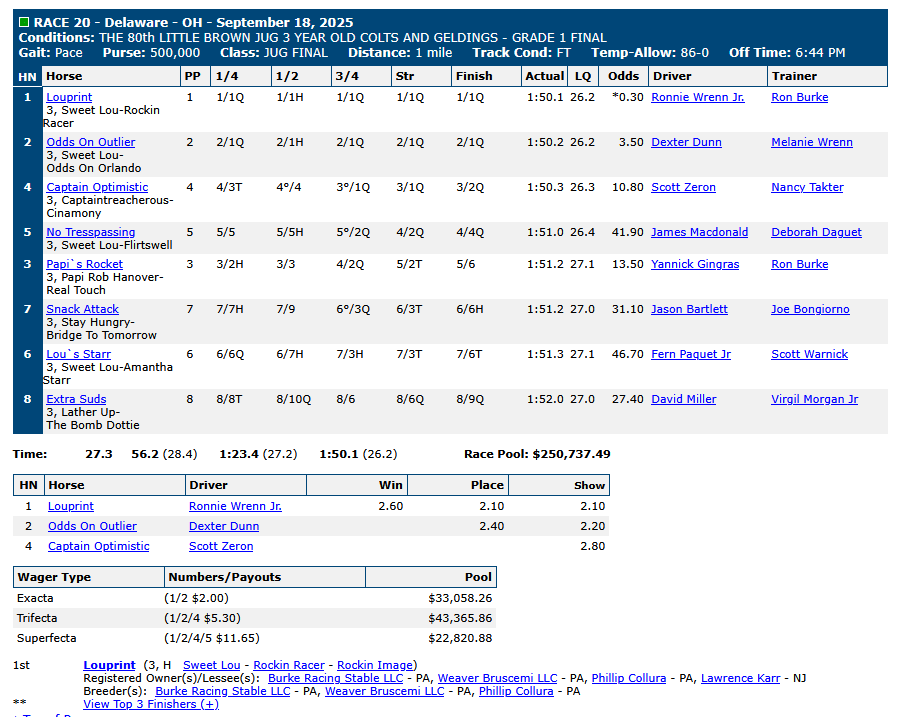 In 2025…Louprint is nine-for-nine on the season and is 16-for-19 during his career. His $275,000 Little Brown Jug payday that moves his earnings for this year to $1.6 million, with his career earnings now at $2,321,766..