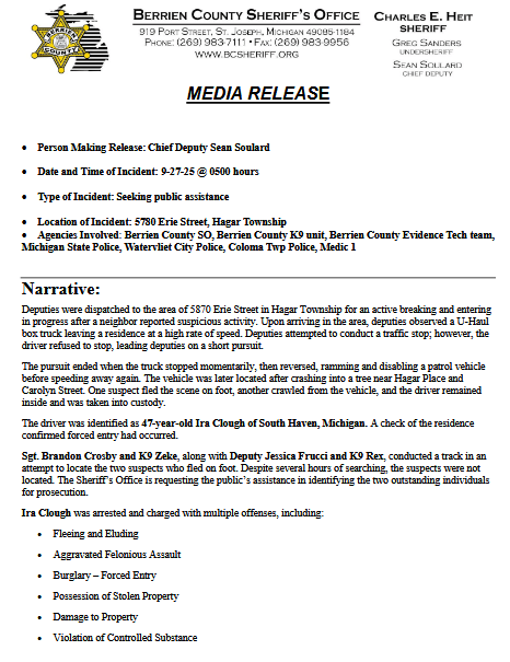 2025, Berrien County Outlook, Uncategorized U-Haul Truck Theft And Pursuit In Berrien County Date: October 15, 2025Author: statelinesportsnetwork 0 Comments Ira Clough Share this: Click to share on X (Opens in new window) X Click to share on Facebook (Opens in new window) Facebook Like Loading... Related