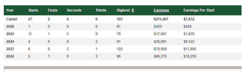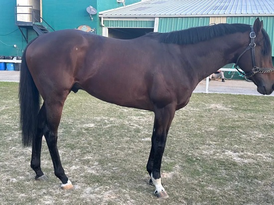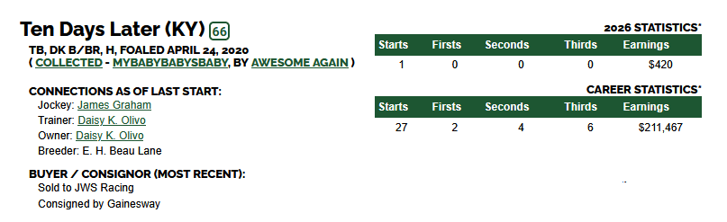 (1-29-26) Ten Days Later is a 6 year old stallion by Collected out of an Awesome Again mare. He is 15.2 and thick! Trainer says no vices and is not studdish but is cheeky and has a big personality. Well mannered. He does have an ossolet that he is sound on(super cute mover actually) and does have range of motion with. Made over 200k. He is RRP eligible. Also, that forelock.